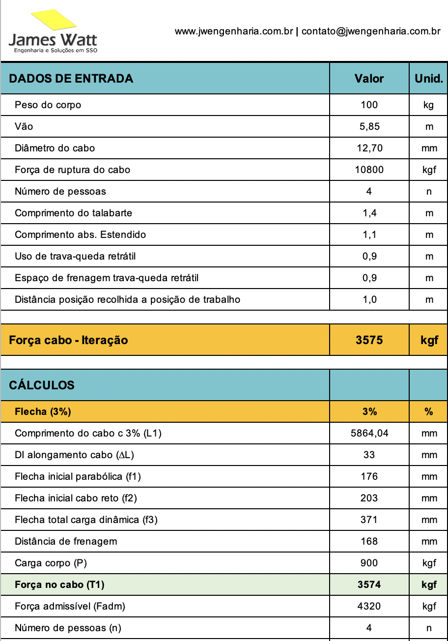 Observação 3: Projetos e soluções para trabalho em altura (segundo a Norma Regulamentadora NR-35 do Ministério do Trabalho) devem ser desenvolvidos por profissionais habilitados. A JAMES WATT ENGENHARIA não controla os dados de entrada para a calculadora Calinvi, uma vez que o Usuário é livre para inserir quaisquer dados de entrada. Assim, os resultados dos cáclulos não podem ser garantidos pela Calinvi. Com base nessas premissas, a JAMES WATT ENGENHARIA não se responsabiliza pelos resultados dos cálculos.
