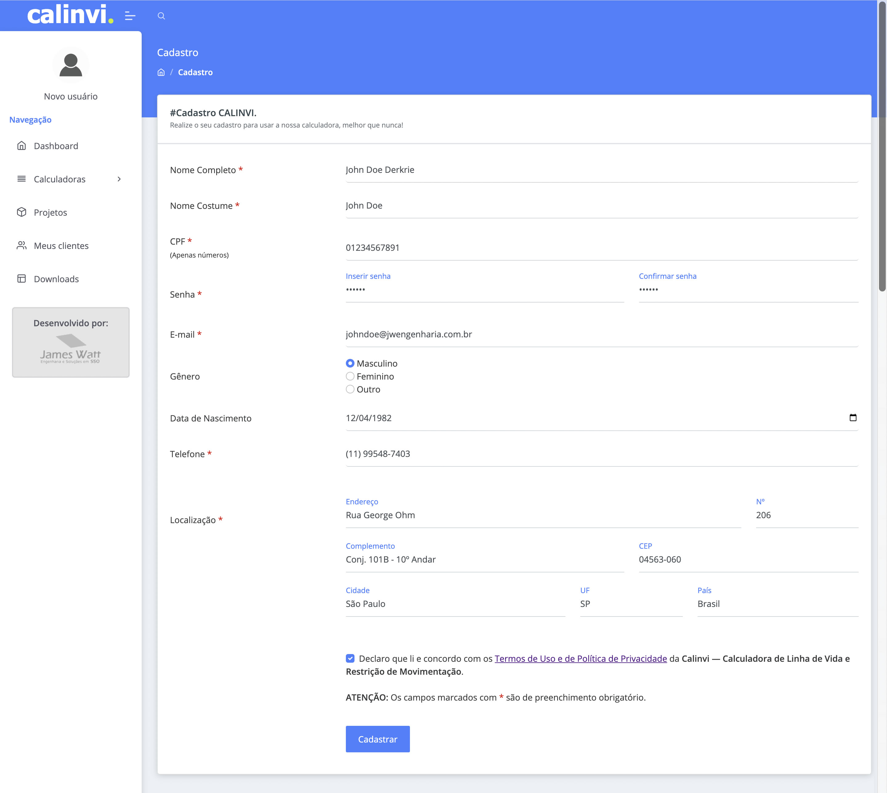 A JAMES WATT SERVICOS DE ENGENHARIA LTDA, estabelecida à RUA SETE DE ABRIL – N° 264 – ANDAR 4 SALA 410 – CEP 01.044-904 – BAIRRO: CENTRO - SÃO PAULO-SP, inscrita no CNPJ sob o n° 24.804.268/0001-44, doravante JAMES WATT ENGENHARIA vem por meio deste presente Termo de Uso e de Política de Privacidade doravante chamado “Termo”, estabelecer as diretrizes de uso e de privacidade de seu Sistema web Calinvi — Calculadora de Linha de Vida e Restrição de Movimentação, doravante “Calinvi”.